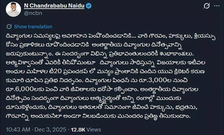 Vijayawada: Chief Minister N Chandrababu Naidu on Wednesday extended greetings on the International Day of Persons with Disabilities, highlighting the need to raise awareness on their rights, dignity, and well-being.
