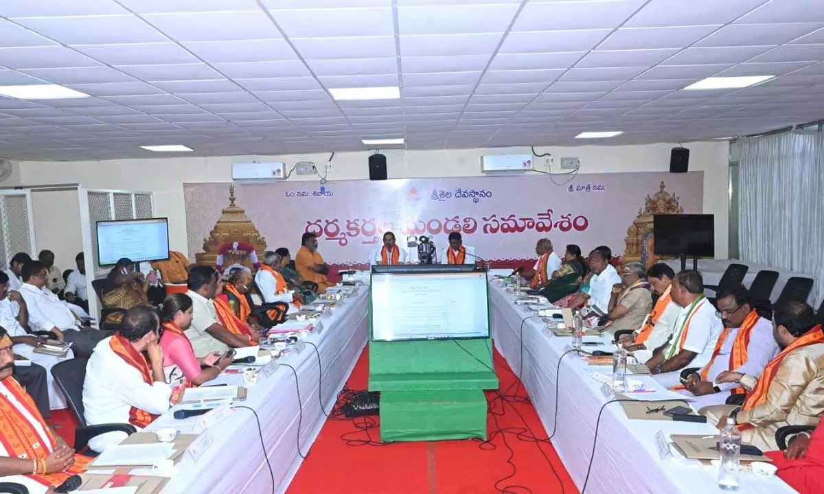 Srisailam (Nandyal district): The Srisailam Devasthanam Trust Board, chaired by Sri Potugunta Ramesh Naidu, met on Wednesday and cleared several important administrative and developmental proposals. Executive Officer (EO) M. Srinivasa Rao, Trust Board members, ex-officio members and special invitees were present. Of the fourteen agenda items placed before the Board, eleven received approval, two were deferred for further examination and one proposal was rejected.