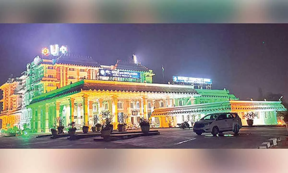 Tirupati: The Tirupati district collectorate was illuminated in vibrant tricolour lights on Saturday evening as part of the build-up to the 75th Republic Day celebrations to be held on January 26. The key administrative complex was decked up in saffron, white and green hues, creating a striking visual against the night sky and drawing the attention of passers-by.