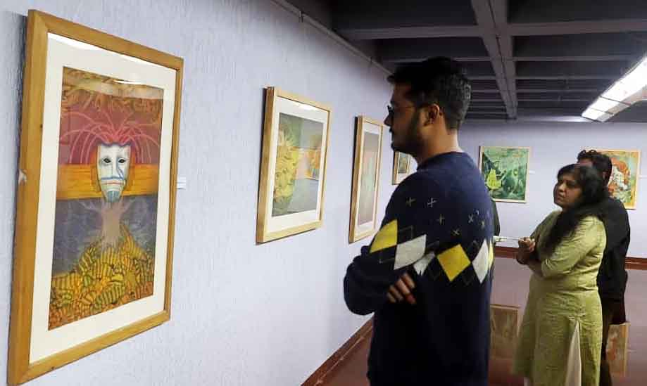 The six-day group exhibition, which began on Tuesday, features more than 45 paintings, ranging from modern social themes to traditional techniques and emotional experiences. A highlight of the exhibition is the collection of paintings by Sachin Gautam, who has used the 100-year-old wash technique, pioneered in India by the renowned painter Abanindranath Tagore, for the first time.