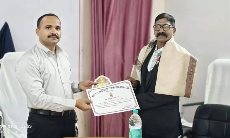 A farewell ceremony was held at the Superintendent of Police’s office in Dhamtari on the occasion of his retirement. Superintendent of Police Suraj Singh Parihar honored Sub-Inspector Dilharan Singh Thakur by presenting him with a shawl, a coconut, and gifts, and praised his long service.