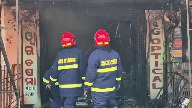 Bargarh: A massive fire broke out in Bargarh town, gutting the market complex in front of the court and destroying goods worth lakhs of rupees. The blaze originated in a spectacle shop and quickly spread to nearby shops.