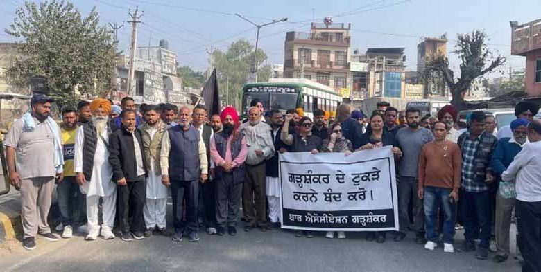 Jalandhar: In protest against the inclusion of Garhshankar in the proposed Sri Anandpur Sahib district, the Garhshankar Bar Association, various political parties, and the Chamber of Commerce held a protest march from the Court Complex to Sri Anandpur Sahib Road, raising slogans such as “Stop dividing Garhshankar,” “Long live public unity,” and “Down with the Punjab government.” During the protest, the call for a half-day market shutdown in Garhshankar received support, and most shops remained closed. During the protest, various speakers expressed their views, stating that the inclusion of Sri Anandpur Sahib in the district would cause inconvenience to the people.