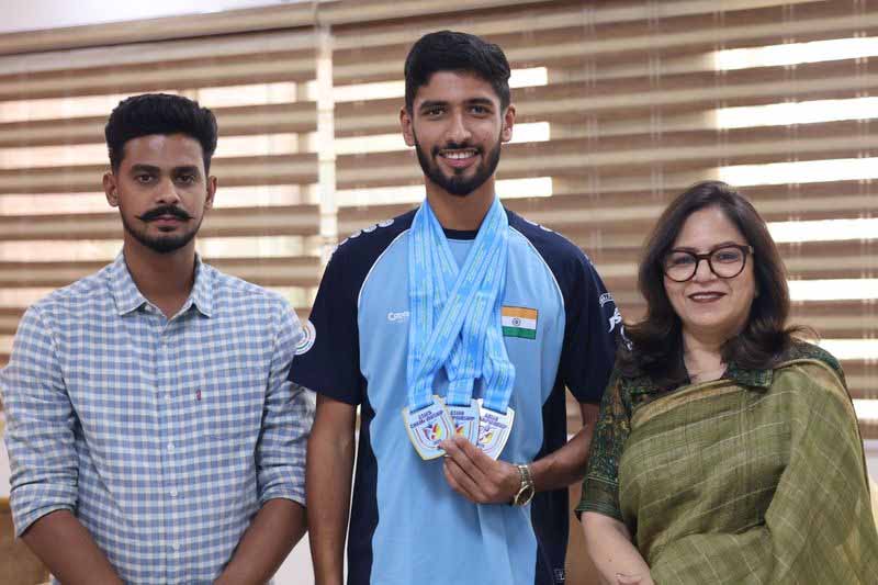 Jalandhar: Harmehar Singh Lali, a student of Apeejay College of Fine Arts, recently brought laurels to the college by winning a medal at the 16th Asian Skeet Shooting Championship held in Kazakhstan. Lali, a fifth-semester Bachelor of Design student, won gold medals in the Skeet Shooting Junior Team (Men) and Skeet Shooting Junior Mixed Team events, as well as a silver medal in the Skeet Shooting Junior Men Individual category. His performance has not only brought laurels to the college but also made his parents proud. Lali learned shooting from his father, Jagdish Singh, a resident of Chuharwali village near here.