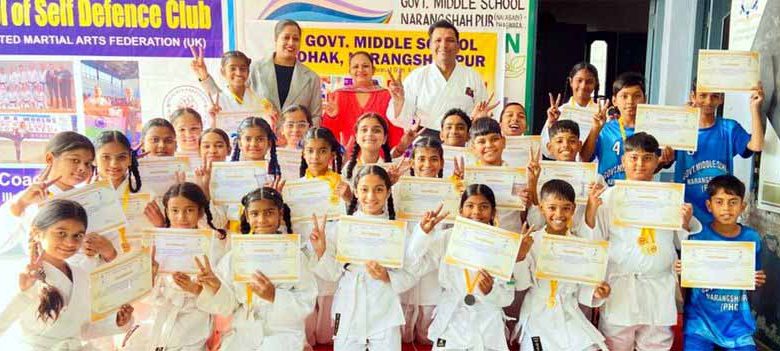 Jalandhar: A two-month martial arts and self-defense training program, initiated by the Punjab Education Department under the Rani Lakshmibai Scheme as per the directions of Education Minister Harjot Singh Bains, concluded at Government Middle School, Dhak Narangshahpur. The training was imparted by Chief Karate Coach Naresh Kumar, a 3rd Dan Black Belt from the Indian School of Self-Defense Club, under the supervision of school in-charge Paramdeep Kaur. On the final day, the students showcased various martial arts techniques and self-defense skills, which were appreciated by all present. During the events held as part of the closing ceremony, winning students were awarded medals and certificates for their performances.