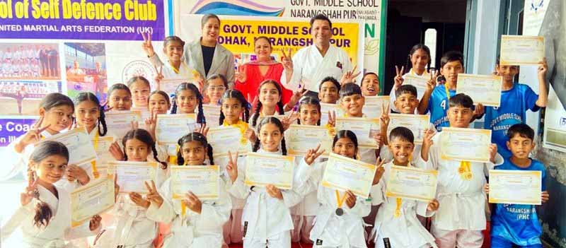 Jalandhar: A two-month martial arts and self-defense training program, initiated by the Punjab Education Department under the Rani Lakshmibai Scheme as per the directions of Education Minister Harjot Singh Bains, concluded at Government Middle School, Dhak Narangshahpur. The training was imparted by Chief Karate Coach Naresh Kumar, a 3rd Dan Black Belt from the Indian School of Self-Defense Club, under the supervision of school in-charge Paramdeep Kaur. On the final day, the students showcased various martial arts techniques and self-defense skills, which were appreciated by all present. During the events held as part of the closing ceremony, winning students were awarded medals and certificates for their performances.