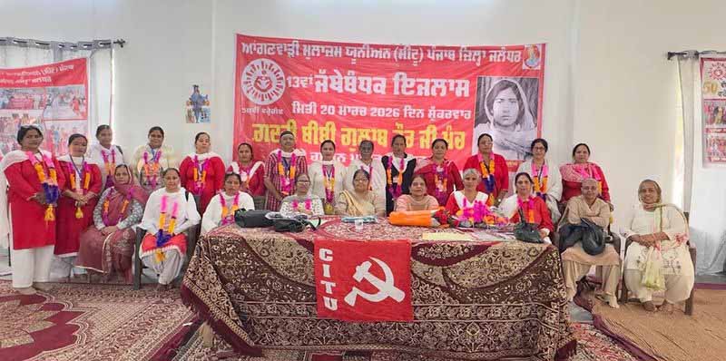 Jalandhar: The 13th conference of the Anganwadi Workers Union Punjab (CITU), Jalandhar District, was held in Nakodar, presided over by Nirlep Kaur and Satwant Kaur. The organization’s flag and the CITU flag were hoisted by Patron Dharamjit Kaur and District President Nirlep Kaur. Vice President Harjit Kaur moved a condolence resolution for the departed members, followed by a two-minute silence observed in their memory. The conference was inaugurated by District Patron Dharamjit Kaur and former IIFA National President Neelam Maitra, who urged the women representatives to resolve their issues through unity and collective struggle. District Treasurer Paramjit Kaur welcomed all the guests and delegates attending the conference. Sodhi Ram Uppal, a leader of the All India Agricultural Workers Union, also addressed the union members.
