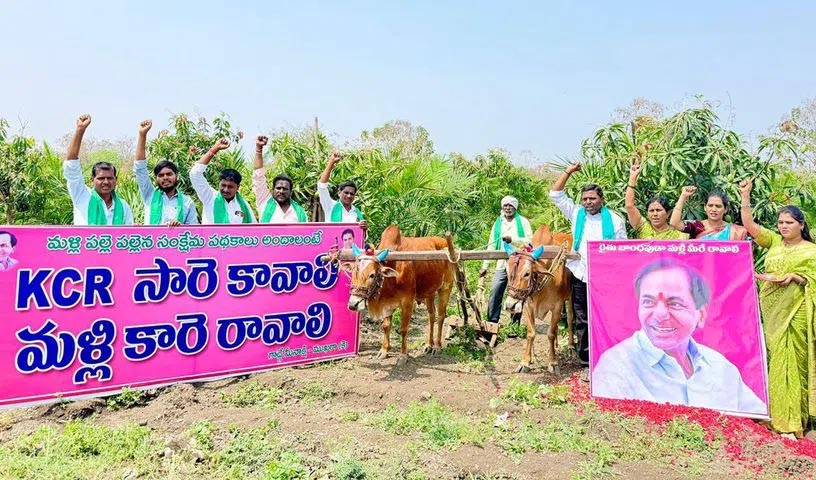 Hyderabad: On the occasion of Ugadi festival, farmers anointed the portrait of Telangana’s first Chief Minister and BRS chief KCR with milk saying, ‘Farmer brother, you should come again.’ In Mukra (K) village of Ichchoda mandal of Adilabad district, farmers displayed posters saying ‘KCR is needed’ and ‘He should come again’.