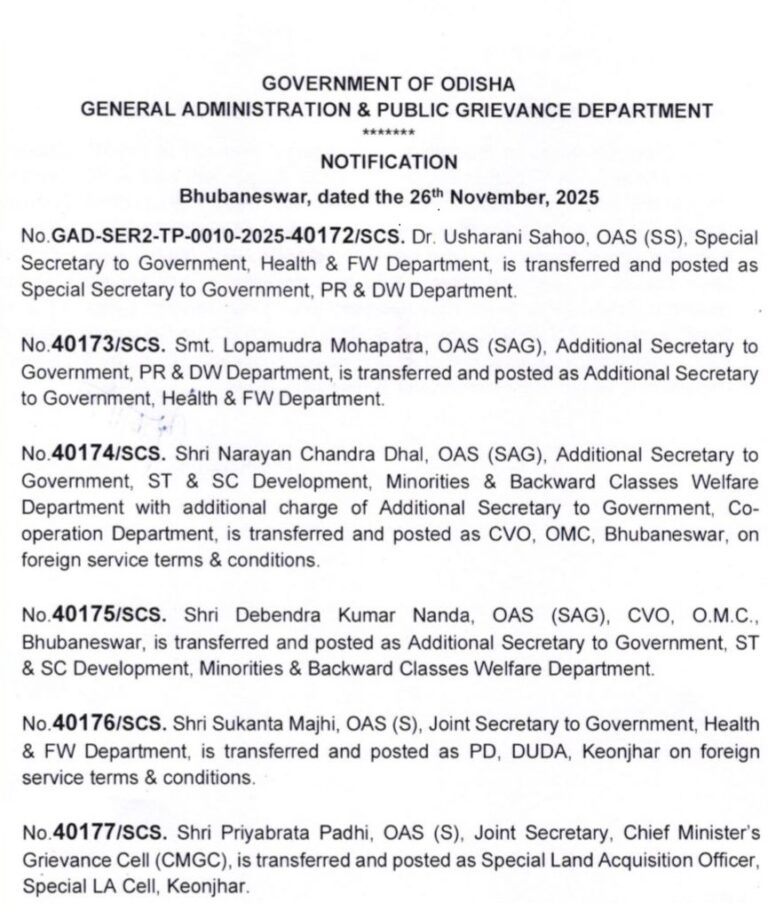 As per the issued notice by the GA & PG Dept Dr Usharani Sahoo, OAS (SS) Special Secretary to Government, Health and Family Welfare Department, was transferred and posted as Special Secretary to Government, PR and DW Department.