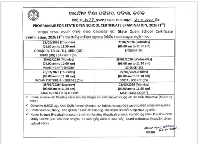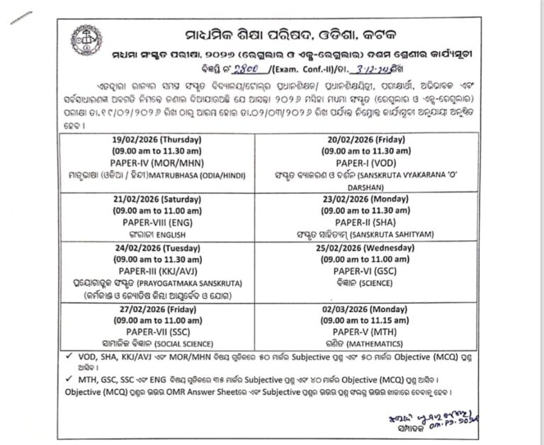 Bhubaneswar: The exam schedule for the Annual High School Certificate (HSC) Exam 2026 has been released a little ago today by the Board of Secondary Education (BSE) Odisha. Along with this Matric exam, the schedule for the Madhyama Sanskrit exam and the SIOS exam have also been released.