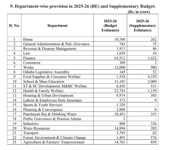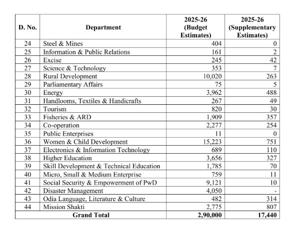 – Education, Skill & Youth Development: Rs. 392 crore for PM-POSHAN, Rs. 320 crore for Odisha Adarsha Vidyalayas, and grants for non-government schools and colleges