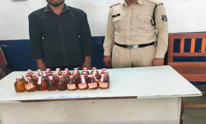 Raipur. Raipur. Police in the Kharora police station area of Chhattisgarh have busted an illegal liquor trade and arrested a young man. Police seized a total of 35 quarter bottles of Sholay country liquor and masala liquor, totaling 6.3 bulk liters of liquor, from the accused. The arrested accused is 22 years old and identified as Ishu Khandelwal, son of Seva Ram Khandelwal, resident of Khapridih Khurd.