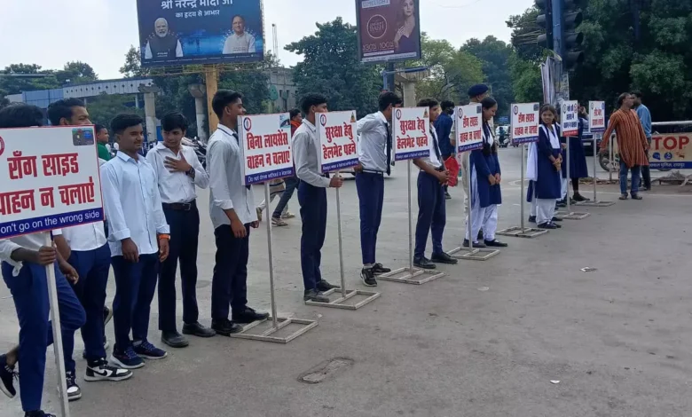 Raipur. As part of the traffic awareness campaign, students of Rashtriya Uchchatar Madhyamik Vidyalaya, located at Kachari Chowk, were educated on traffic rules on 10 October 2025. Today, 60 students from Rashtriya Vidyalaya, along with their sports teacher and traffic police instructor, TK Lal Bhoi, and constable Sahdev Verma, took to the streets at Shastri Chowk, carrying placards with traffic rules written on them, to teach drivers about traffic rules.