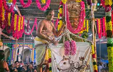 On this occasion, the temple flag, Ganesha, and Nandi were anointed. Later, while chanting Vedic mantras, priest Rajappa Shivacharya hoisted the flag depicting Nandi, marking the beginning of the festival. Following this, a parade was held on the Panchamurthi Street. A large number of devotees, including Board of Trustees Chairman Ravi and Administrative Officer Murugan, participated in it.