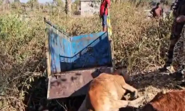 Jashpur. A sensational case of cow smuggling has come to light in the district. The smugglers were transporting 10 cows in a pickup truck from Chhattisgarh to Jharkhand. When police attempted to stop the vehicle, the driver sped away, causing the vehicle to overturn, killing three cows on the spot. The smugglers fled the scene. This incident occurred in the Tapkara police station area.
