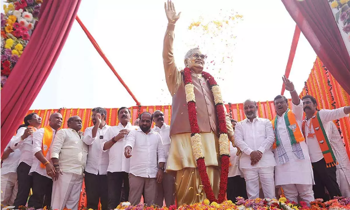 Visakhapatnam: Union Minister of State for Home Affairs, Bandi Sanjay Kumar, unveiled a bronze statue of former Prime Minister Atal Bihari Vajpayee at Park Hotel Circle in Visakhapatnam. Addressing a large gathering of BJP workers and local residents, he lauded Vajpayee as a visionary leader who brought dignity to public office and won the hearts of millions through value-based politics.