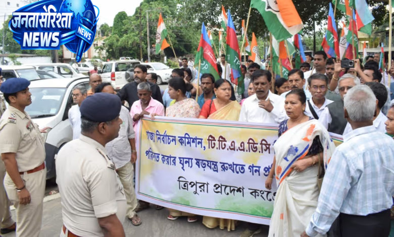 Tripura: The Tripura Pradesh Congress held protests across the state on Thursday, April 9, regarding the TTAADC elections. The party alleged that the election process was being made a “mockery” and lacked transparency.