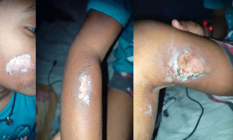 Teja Nandan, a seven-year-old boy from OU Colony in Sheikhpet, is studying in class one. His parents send him to a local teacher named Manasa for tuition. Like every day, he went for tuition on Thursday evening. However, because he was not studying properly, she burned his legs, hands and face with a stick. As a result, the boy suffered burn injuries in 8 places on his body. Upon learning about the matter, the parents filed a complaint against the tuition teacher at the Filmnagar police station. The boy was sent to the Golconda Area Hospital for medical examination. Teja Nandan is unable to walk due to his injuries. They are demanding strict action against Manasa, who indiscriminately burned their son with a stick.